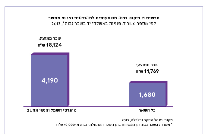 1. ריבוי משרות פנויות בשכר גבוה: הנתונים מעידים על ריבוי משרות פנויות בשכר גבוה במקצועות ההנדסה והמחשבים. לפי נתוני מנהל מחקר וכלכלה במשרד הכלכלה משנת 2013, רוב המשרות הפנויות, במקצועות שבהם השכר גבוה מ-10,000 שקלים, הן של מהנדסי חשמל ואנשי מחשבים.