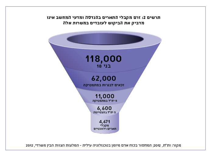 3. זרם בוגרי התיכון המתאימים אינו מספק: בשנת 2009, מתוך 118,000 בני השמונה עשרה, מספר הזכאים לבגרות במתמטיקה עמד על כ-62,000 תלמידים. מתוכם כ-11,000 תלמידים נמצאו זכאים לבגרות ברמת חמש יחידות לימוד. מתוך תלמידים אלה, רק כ-6,600 תלמידים סיימו בחינה זו בהצטיינות, כלומר, בציון הגבוה מ-85. מדובר על כ-5.6% בלבד מתוך שכבת הגיל בכללותה. למעשה, בוגרי תיכון מצטיינים אלו הם מאגר העובדים הפוטנציאלים העתידי בענף ההייטק. יש להביא בחשבון כי תלמידים המסיימים בהצטיינות חמש יחידות לימוד במתמטיקה פונים ללימודים אקדמיים גם במקצועות נוספים, כמו רפואה, משפטים וכלכלה, ולאו דווקא ללימודי מדע וטכנולוגיה. בפועל, מיעוט בוגרים מצטיינים אלו משפיע בהכרח על המספר הלא מספק של המהנדסים ומדעני המחשב. ואכן, מספר מקבלי התארים במקצועות הרלוונטיים – הנדסת חשמל, הנדסת אלקטרוניקה, הנדסת מחשבים, הנדסת תוכנה, מדעי המחשב ופיזיקה – עומד על 4,671 סטודנטים במחזור[1]. זאת לעומת כ-7,000 משרות חדשות הנוצרות מדי שנה בענף ההייטק[2].