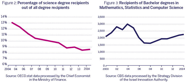 As mentioned above, it is evident that the infrastructural challenge due to a skilled labor shortage is a major obstacle to the growth of both startups and more established companies, which limits the possibility of a significant activity increase in the field. Moreover, the Chief Economist at the Ministry of Finance recently[6] estimated that the stagnation in the hi-tech’s relative share in employment, reflects the constraint on the supply-side, a claim supported by the significant decline, over the past decade, in the percentage of degree recipients majoring in sciences (Figure 2). One of the reasons for this is the sharp drop in the number of graduates in the fields of Computer Science, Mathematics and Statistics, as of 2005 and subsequent years – from a peak of about 3,000 graduates in 2004, to a low of 1,600 graduates in 2008. Despite some recovery in recent years, to date, the number of Computer Science graduates still has not returned to the scope of the early 2000s. This shortage is also reflected in the World Economic Forum index that ranks Israel 17th in the ease of finding skilled employees[7].