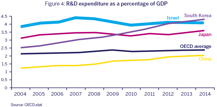R&D investment as a percentage of GDP is an important macroeconomic indicator that demonstrates Israel’s position in comparison to other countries – a datum acceptable as an estimate of the level of innovation inputs to an economy. Over the years, this figure reflected Israel's relatively large investment in technology and innovation, and Israel indeed has been an unchallenged leader during most of the last decade. In 2014, for the first time after many years of leading this index, Israel was surpassed by South Korea, which invested 4.3% of GDP in R&D, while Israel's R&D expenditure stood at 4.1%. This result is not accidental, and it stems from the realization in many countries that innovation-based industry is a key to sustainable growth, and resources should be invested accordingly[8].