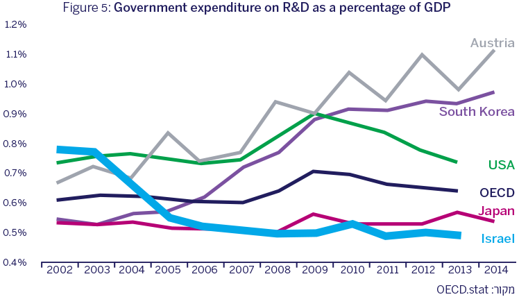 A more thorough examination of R&D investment figures shows that in many countries, especially in South Korea, the increase in R&D investment is also due to an increase in government financing (in Korea – about a quarter of the total increase), in addition to an increase in investment by the private sector (Figure 5). On the other hand, Israel has adopted the opposite policy: the percentage of government expenditure on R&D has decreased over the years, and today is well below the OECD average.