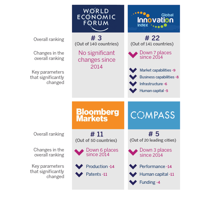 [9] The selected indices are: the innovation section of the WEF Global Competitiveness Index; Global Innovation Index jointly published by WIPO, Cornell University and INSEAD business school; Bloomberg Innovation Index; world’s top 20 startup ecosystems by COMPASS (formerly Startup Genome).